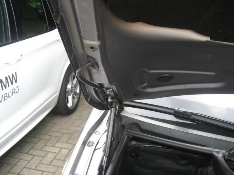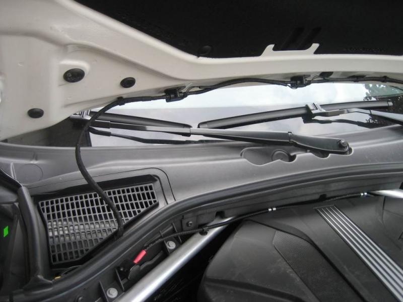 Beim Blick unter die Motorhaube stellt man fest, dass im Vergleich zum E83 im F25 noch sehr viel Platz im Motorraum ist. An die Scheinwerfer zum eventuellen Tausch der Xenonlampen kommt man sehr gut ran. Auffällig ist, dass das "Staufach" zum Einbau einer Standheizung oder Transportfach für Ersatzöl etc. so nicht mehr vorhanden ist. Wo wird eine Standheizung untergebracht? Weiterhin sieht die Haubenentriegelung doch sehr filigran aus. Gleiches gilt für die Verkabelung der Scheibenwaschanlage. Dies finde ich im E83 optisch besser gelöst.