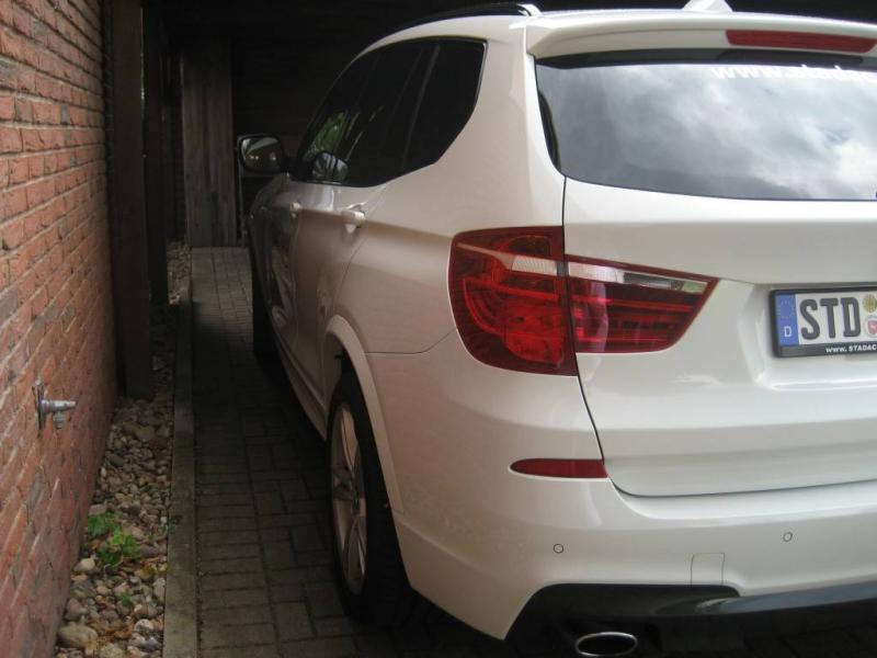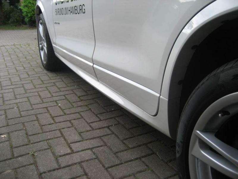 Trittbretter gibt es bei dem F25 nicht, dafür sind aufgrund des M- Pakets die Schweller in Wagenfarbe lackiert. Gefällt mir ganz gut, jedoch ist die Seite jetzt wieder anfälliger gegen fremde Fahrzeugtüren und Einkaufswagen...