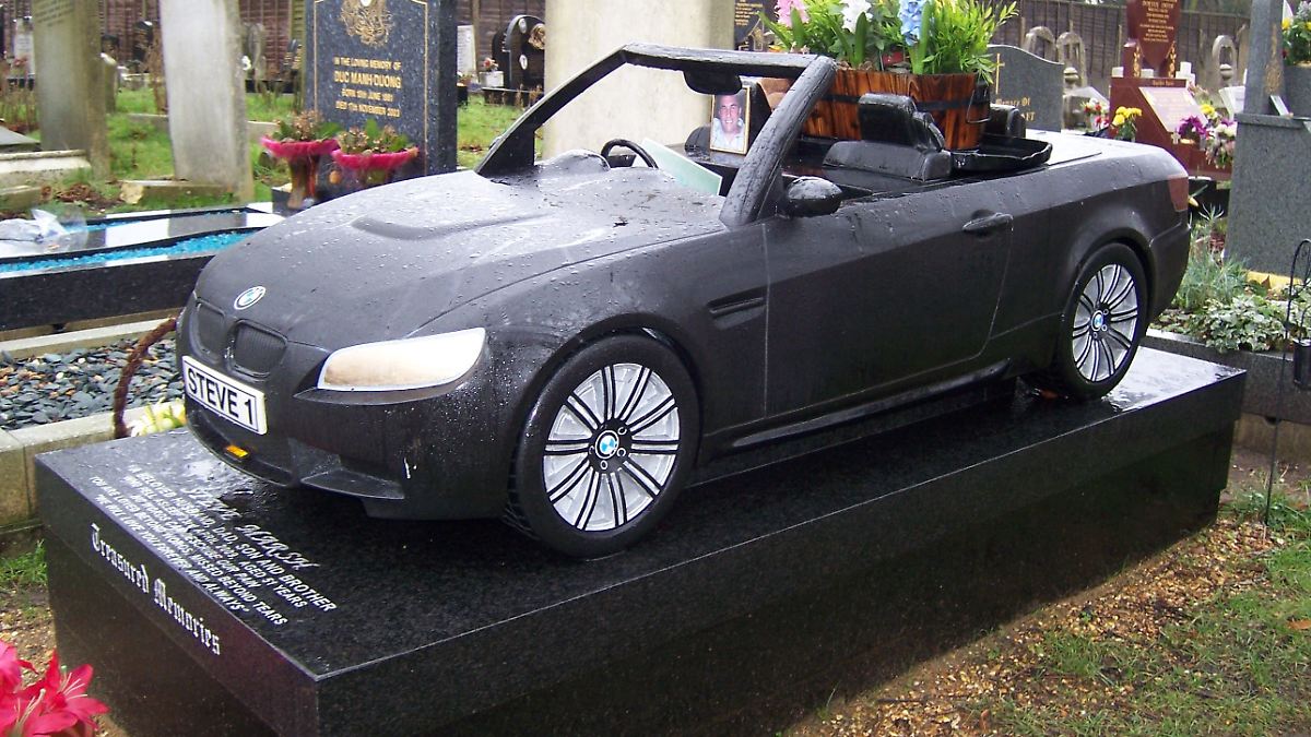 Das Cabrio ist schick - glänzendes Schwarz, gute Marke. Und dennoch fährt es nicht. Es ist ein Grabstein auf einem Friedhof in London. Die britische Bestattungskultur erlaubt Individualität, und damit so einiges, was in Deutschland unvorstellbar wäre.