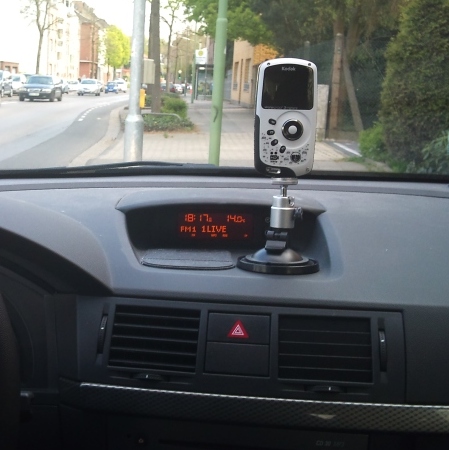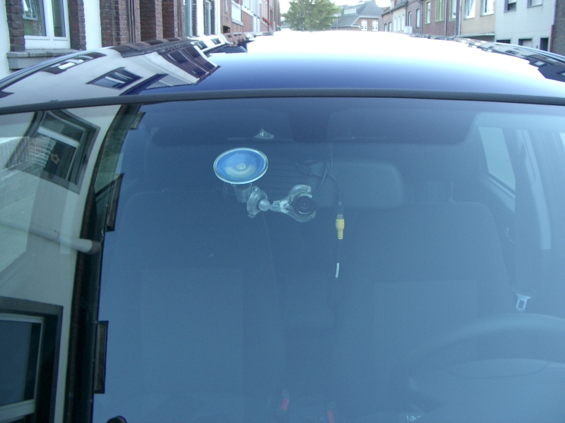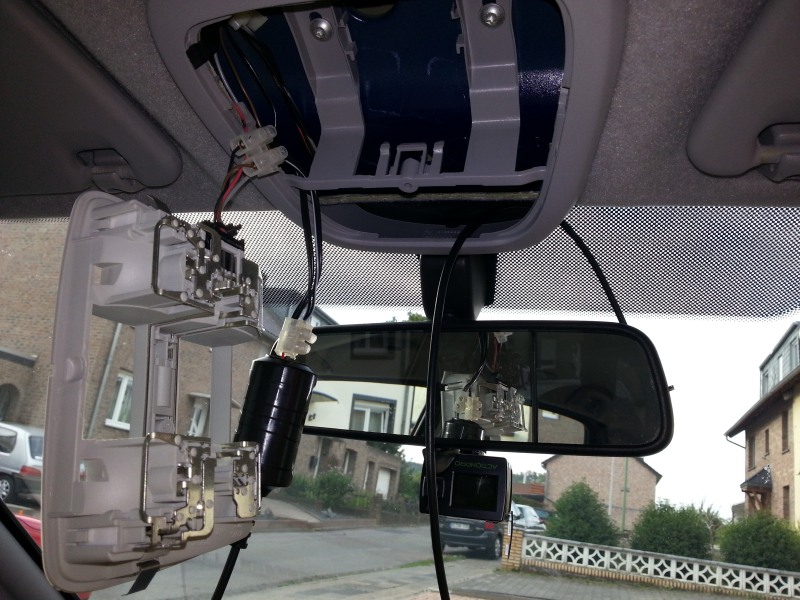Angebracht habe ich sie Kopfüber unter/hinter dem Rückspiegel. Ein flaches Stromkabel mit Micro USB muss ich mir noch zulegen, daher erstmal provisorisch verlegt. Ein Akku (zwei sind dabei) hält je nach Auflösung zwischen 60 und 80 Minuten. Ich habe gestern über 70 Min geschafft und war dann wieder zu hause...