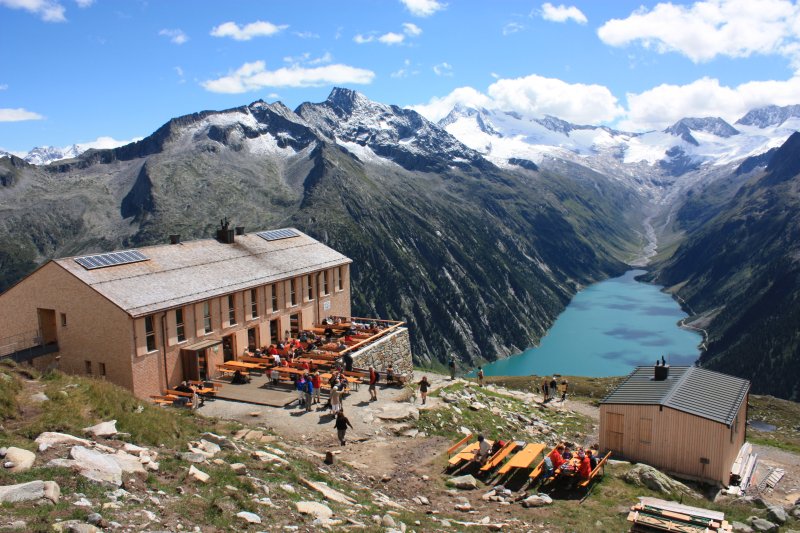 Das zweite Bild zeigt die Olpererhütte im Zamser Tal auf 2.389 m oberhalb des Schlegeisspeichers, der auch schon auf 1.782 m liegt. Im Hintergrund sind die Zillertaler Alpen mit den schneebedeckten Spitzen zu sehen, ein traumhafter Blick, den man sich aber auch erst einmal schweißtreibend erarbeiten muss. Zum Schlegeisspeicher als Ausgangspunkt für die Tour zur Olpererhütte gelangt man von Hippach an Mayrhofen vorbei über Ginzling und schließlich über eine wunderschöne Mautstraße hoch zum Speicher.