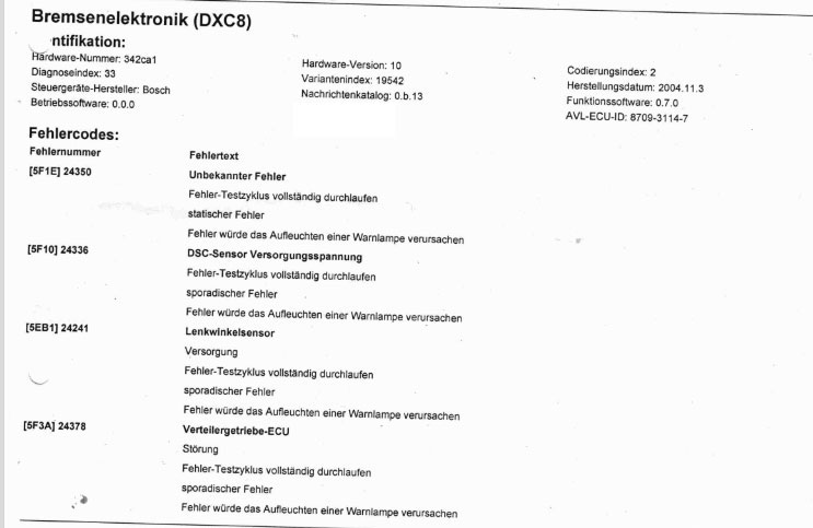 Wodurch ich zuerst einen defekten Raddrehzahlsensor (oder Kabelbruch etc. zum Sensor (ABS-Kontrollleuchte) und als Folgefehler, durch das Fehlen des ABS-Signals, den Ausfall des DSC/Allrad (4x4-Kontrollleuchte) vermutete.