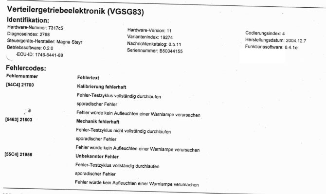 Ich gehe davon aus, dass der Fehlerspeicher ausgelesen wurde. Interessant wären die abgelegten Fehlereinträge des Verteilergetriebesteuergerätes (VGSG83) und evtl. Fehler bez. des ABS etc..