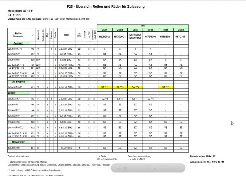 So - Tüvauskunft war auch negativ und dann hab ich vom BMW-Zentrum die für E83 und F25 zugelassene Bereifung als Tabelle bekommen. Da stehen sie auch nicht drin. Wenn ich daheim bin, poste ich sie!