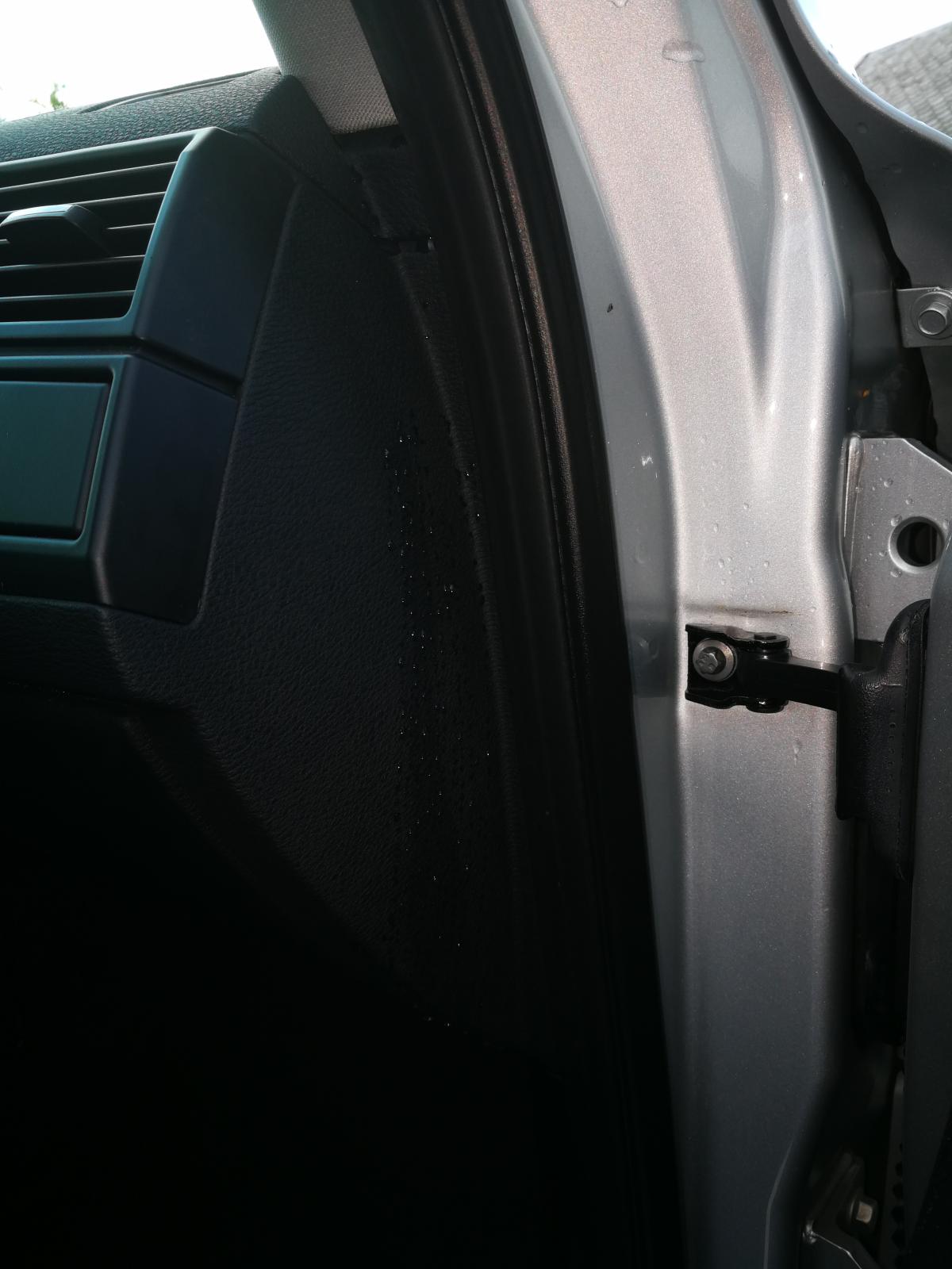 Bei meinem X3, BJ 2009, X83 laeuft bei Starkregen Wasser von der A-Saeule aus der Innenseite in den Fussraum. In dem Bild kann man die Tropfen gut erkennen. Lt. meiner Recherche hier ist ein undichtes Panoramadach als Ursache zu nennen oder generell ein Verstopfen der Ablaufloecher.