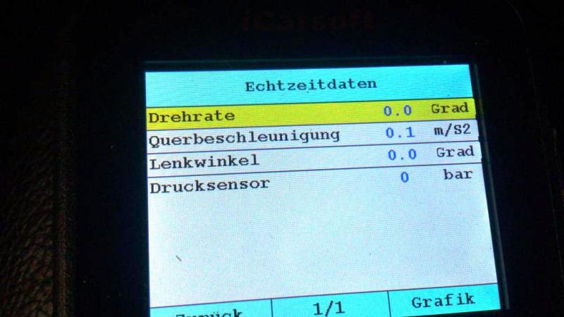 Die Echtzeitdaten auf dem dritten Bild zeigen erstmal einen leichten Lenkeinschlag. Drehrate, Querbeschleunigung und Lenkwinkel sollten bei absolut gerade stehendem und leerem Fahrzeug bei Lenkradmittelstellung Werte von 0,0 anzeigen.