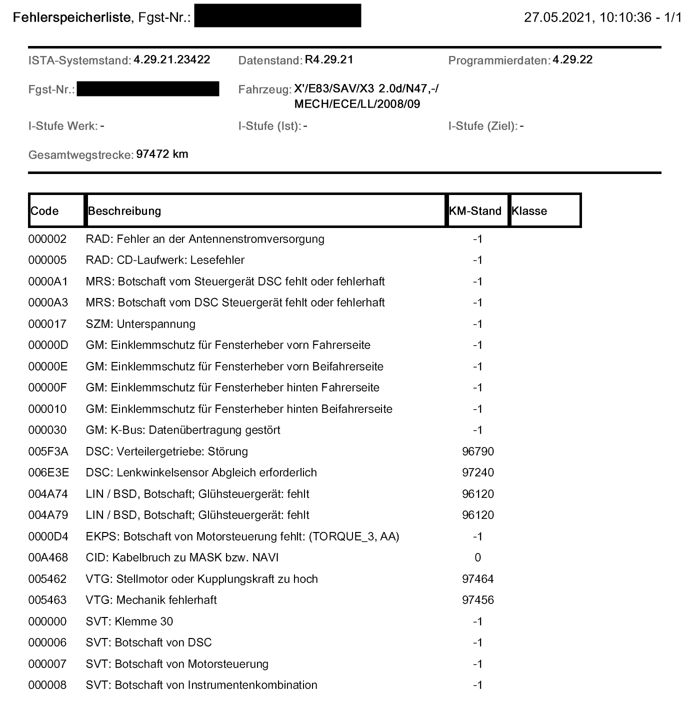 Da mein Händler 250 km entfernt ist, war ich auf sein Bitten erst einmal beim BMW, um den Fehlerspeicher auszulesen (siehe Bildanhang). Dazu muss man wissen, dass ich selber die Batterie ca. 20 min abgeklemmt hatte (ca. bei 97k). Und dass der Motor vorm Kauf ausgebaut wurde, um die Steuerketten zu wechseln (Anfang 96k). Danach wurde der Fehlerspeicher jeweils nicht gelöscht. Nach Motorausbau wurde (wenn ich das Richtig verstanden habe) im Steuergerät nur die „Inspektion“ als durgeführt abgehakt.
