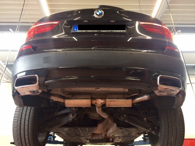 Der alte Endschalldämpfer wurde entfernt. Auf dem einem Bild mit Sicht unter das Auto kann mehr sehr schön den Beginn des neuen Abgasstranges sehen. Mittig vom Heck spreizt sich die neue Edelstahlanlage in zwei neue Endtöpfe mit entsprechender Dämmung (je nach Wunsch, bei mir die leise Variante). Aus den neuen Endschalldämpfern wurde ein 90°-Endrohr verschweißt, dieses ragt nun in die doppelwandige und ebenfalls aus Edelstahl bestehende Heckschürzenblende lose hinein. Die Blende wurde mit dem unter der Heckschürze vorhanden Träger verbunden und zusätzlich noch beidseitig verschraubt. Somit kann die Abgasanlage sich bei Temperatur ausdehnen und beim Start wackeln ohne das die Blende davon berührt wurde.