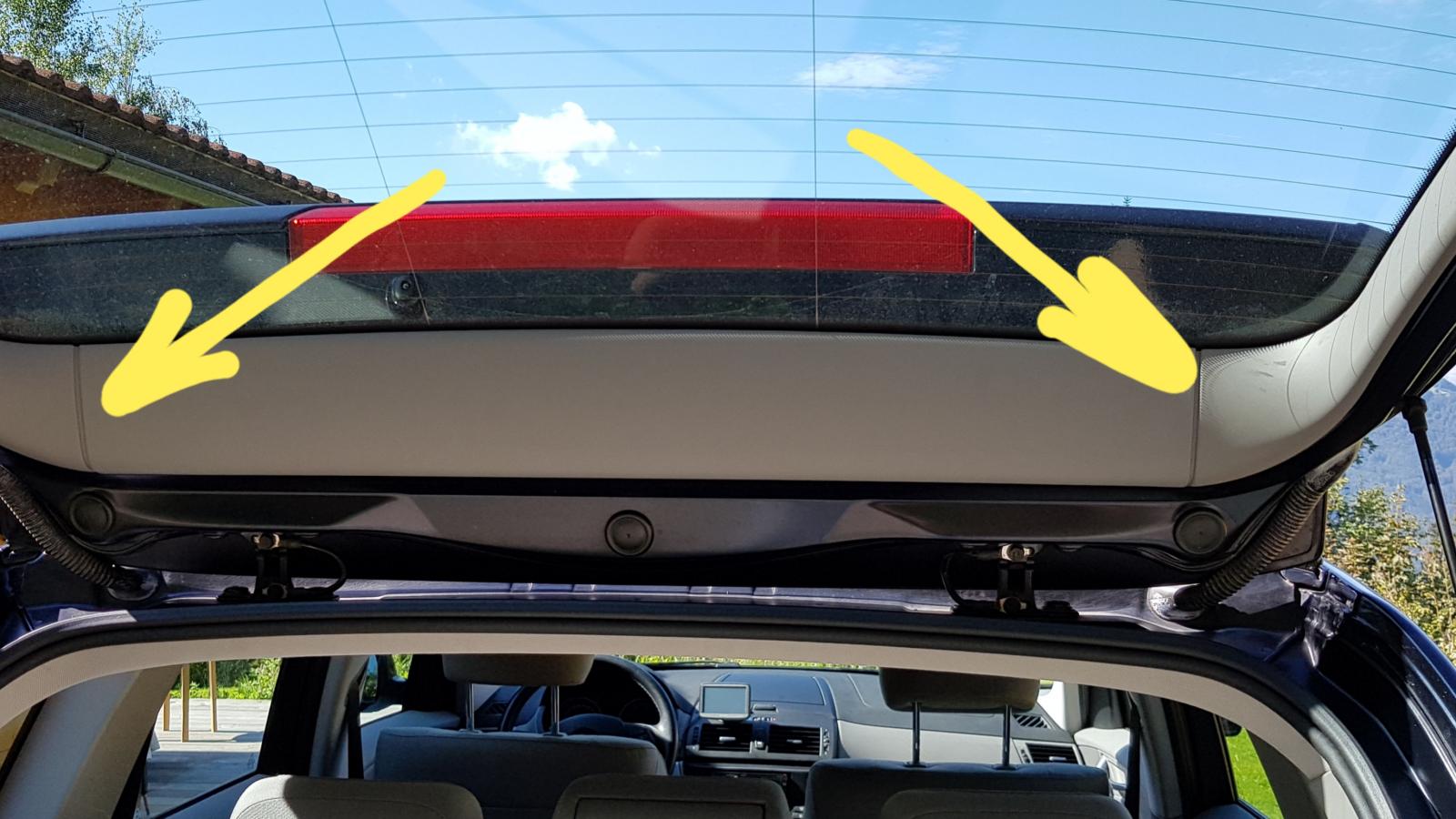 Um die 2.000 U/min hatte mich also immer so ein Vibrieren von irgendeinem Plastikteil hinten im Innenraum gestört und gestern bin ich endlich draufgekommen woher das kam und ich konnte es ziemlich einfach beheben. So wie ich das sehe, müsste das Problemchen eigentlich tendenziell bei vielen E83 Exemplaren vorhanden sein, denn wie ich gestern endlich entdeckt habe, gibt es da diese Verkleidungsteile an der Heckklappe, die gegen den Metallrahmen nicht gedämpft sind, und zwar genau hier: