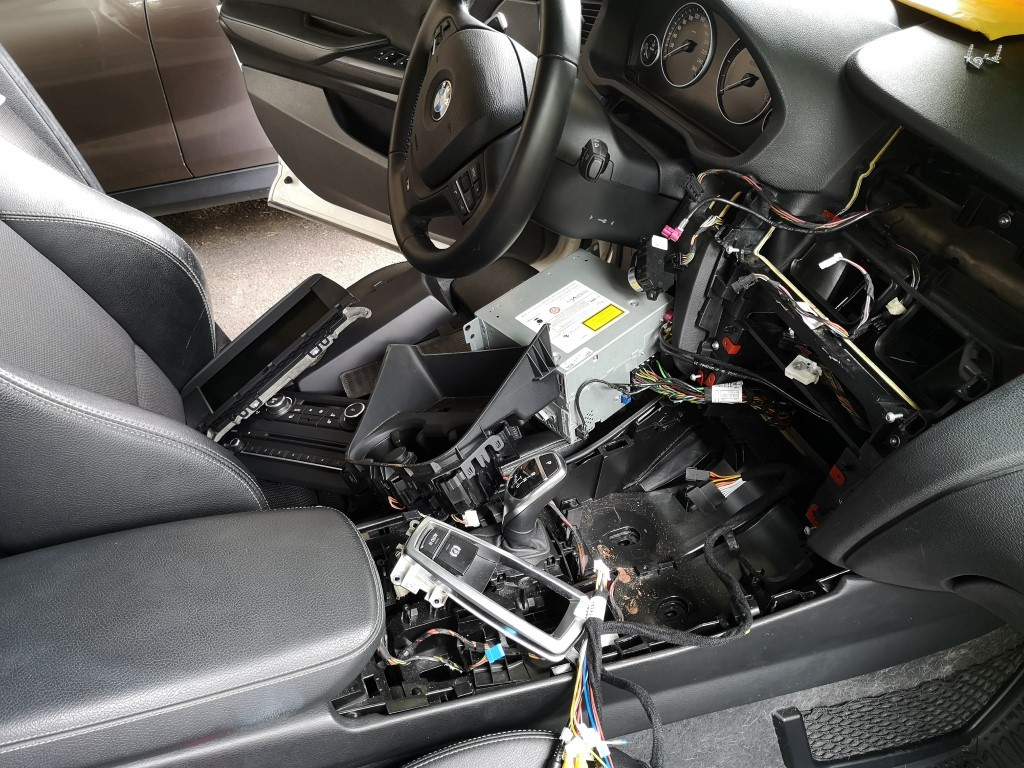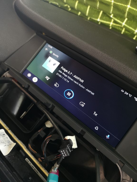 Eingebaut habe ich es zuerst mal nur provisorisch, wollte natürlich abchecken ob alles so funktioniert wie's soll. Für den ersten Check musste ich nur Display und iDrive Controller ausbauen, denn nur da werden die Kabel des Interface, welche erstaunlicherweise von 1a Qualität sind, zwischengesteckt, und et voila, es funktioniert einwandfrei. Mit meinem Huawei P20 Pro leider nur Kabelgebunden (Huawei-Google?) aber mit dem IP XS meiner Frau kabellos. Die beiden Systeme, also BMW und Car Play laufen parallell und zeitgleich, weshalb auch Radio und Rückfahrkamera ohne Probleme funktionieren und simultan umschalten.
